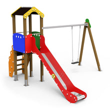 Accés a la torre principal mitjançant escales, els colors vius i la teulada a dues aigües fa d'aquest parc infantil un producte molt atractiu i amb el gronxador acoblat es converteix en una solució compacta per a tot tipus d'espais.