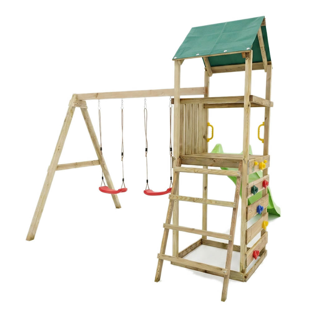 El parque infantil de madera Max-Play 2.1 con tobogán verde es una completa zona de juegos para el jardín diseñada para ofrecer diversión, actividad física y juego creativo al aire libre. Su torre elevada con techo impermeable, el tobogán ondulado de 2,2 metros, la pared de escalada y el columpio doble permiten que varios niños jueguen al mismo tiempo mientras desarrollan coordinación, equilibrio y habilidades motoras.