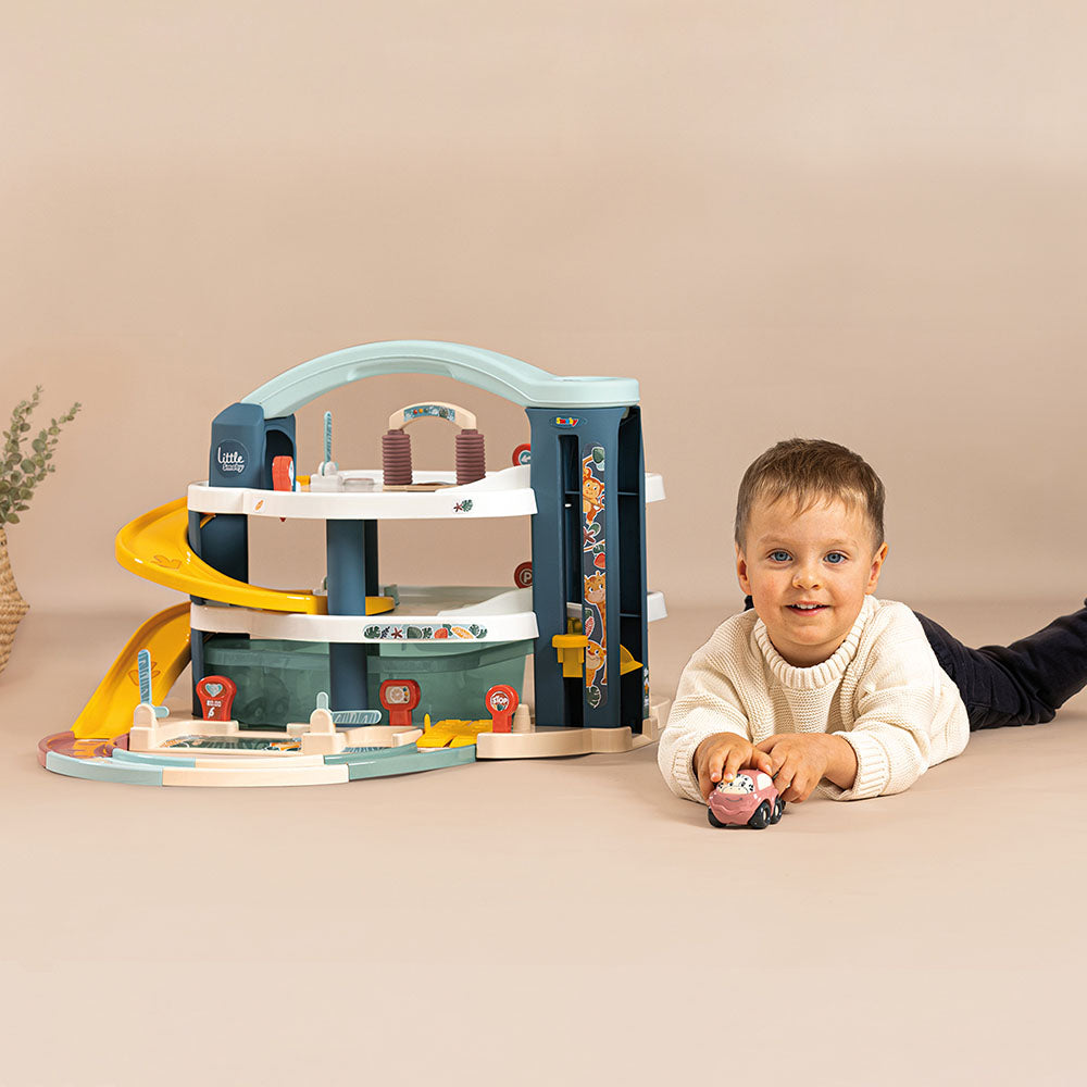 El Smoby Gran Garaje és un centre de joc multifuncional dissenyat per a nens a partir de 18 mesos, que ofereix una experiència de joc dinàmica i educativa. Aquest garatge de tres nivells és ple de característiques interactives que fomenten la creativitat i el desenvolupament d'habilitats motores en els més petits.
