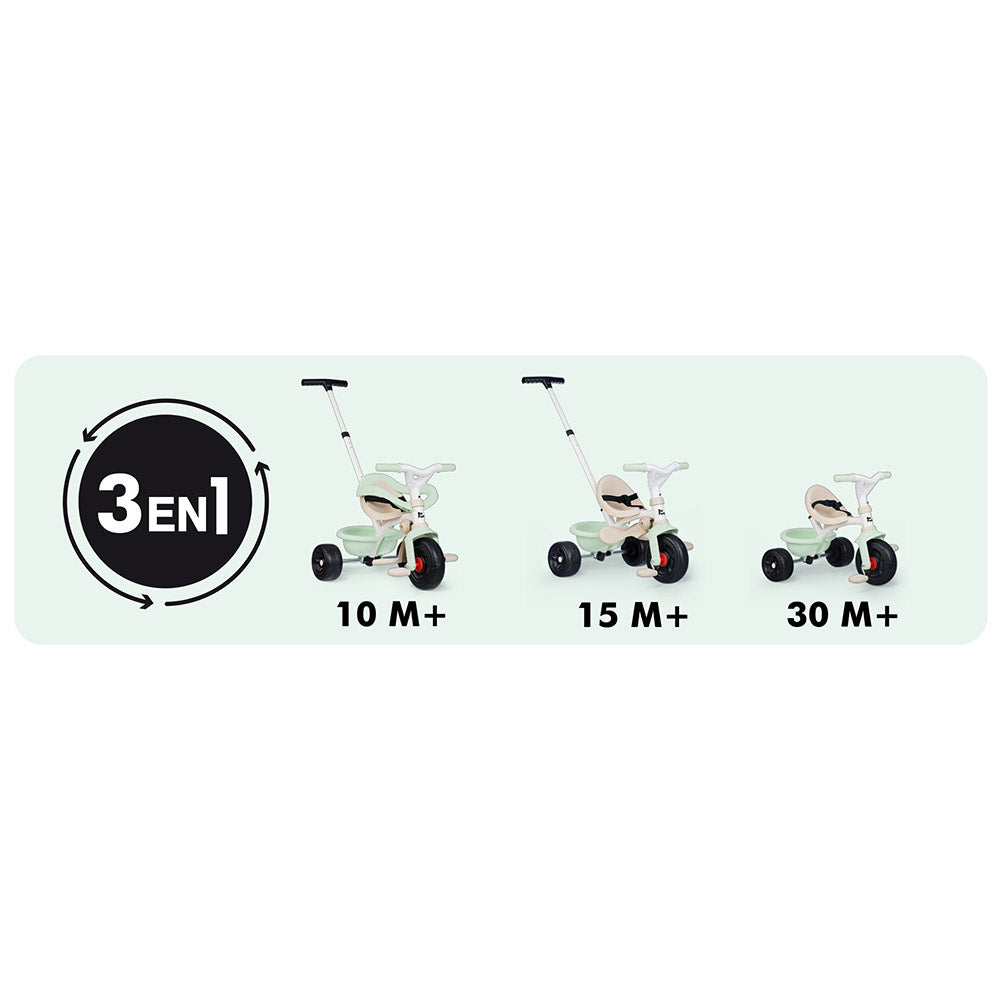 El triciclo Be Fun Confort de Smoby es un vehículo evolutivo para niños que acompaña su crecimiento. Diseñado con funcionalidades de seguridad para la etapa inicial (asa de empuje para padres, arco de seguridad, cinturón, reposapiés) y luego con elementos que se retiran para que el niño pedalee solo. Ideal para uso interior o exterior desde aproximadamente los 10 meses hasta los 3‑4 años.