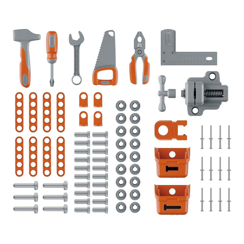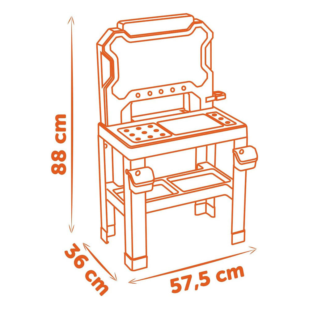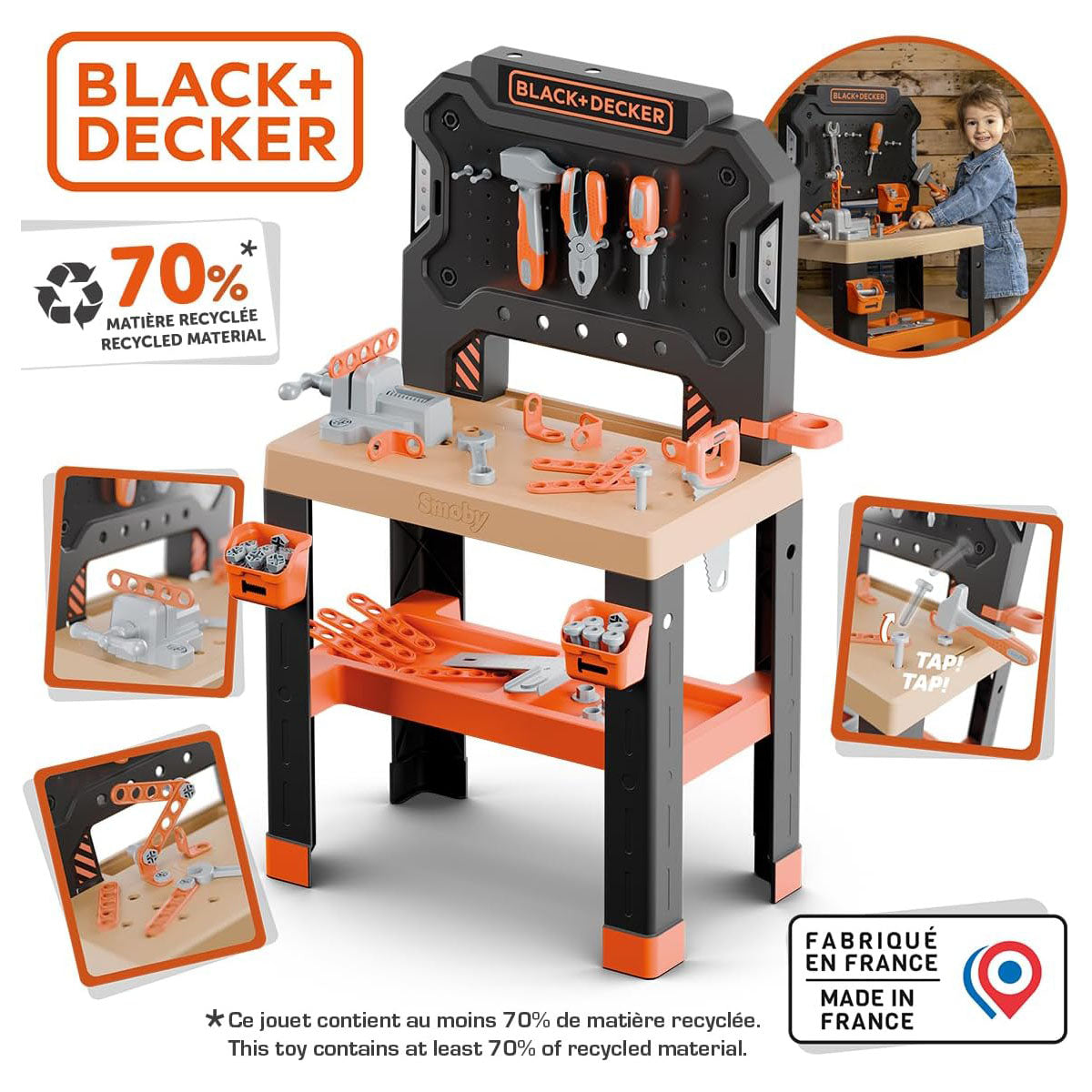 Este banco de trabajo infantil con licencia oficial ® Black+Decker permite que los niños, a partir de aproximadamente 3 años, se introduzcan en el mundo del bricolaje a través del juego. Está fabricado en parte con plástico reciclado, ofrece gran robustez, superficie amplia de trabajo, siete herramientas de juguete (sierra, martillo, llave, destornillador, alicates, escuadra, tornillo‑prensa) y multitud de piezas accesorias (tornillos, tuercas, clavos, tablas de construcción) para crear y jugar libremente.