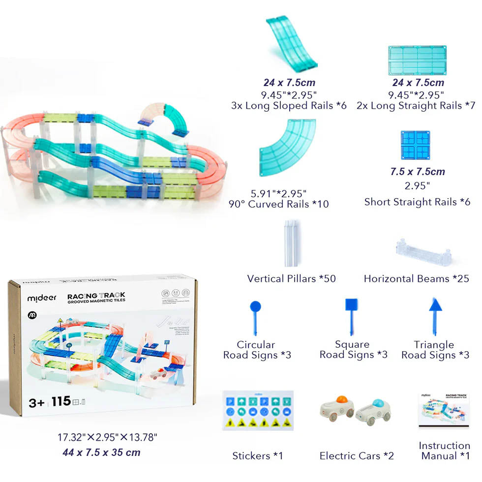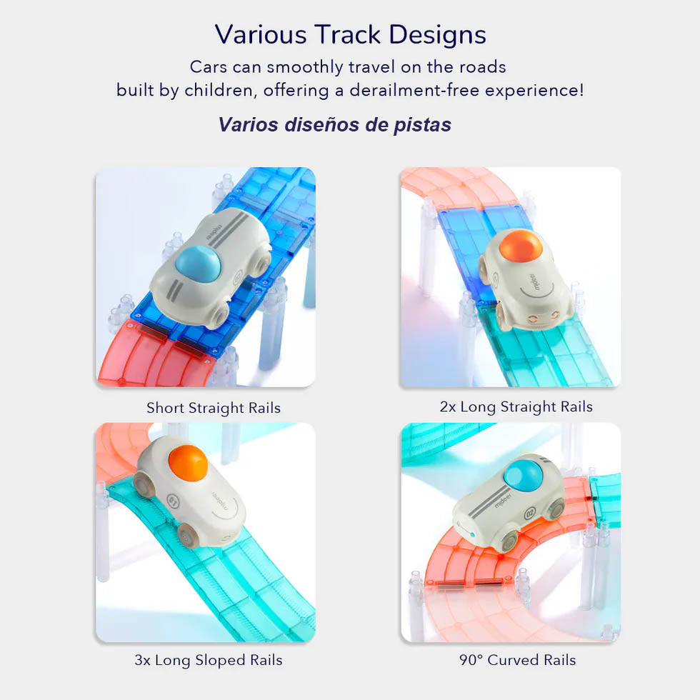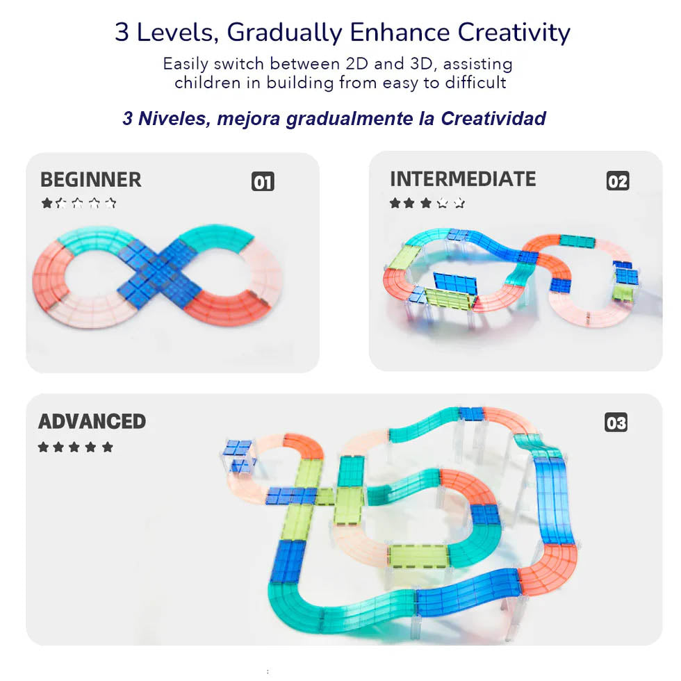 Este completo set de 115 piezas permite crear múltiples configuraciones, fomentando la creatividad, la planificación y la experimentación con el equilibrio y la estabilidad. Gracias a sus imanes internos de alta calidad, las estructuras se mantienen firmes mientras los coches circulan por la pista.