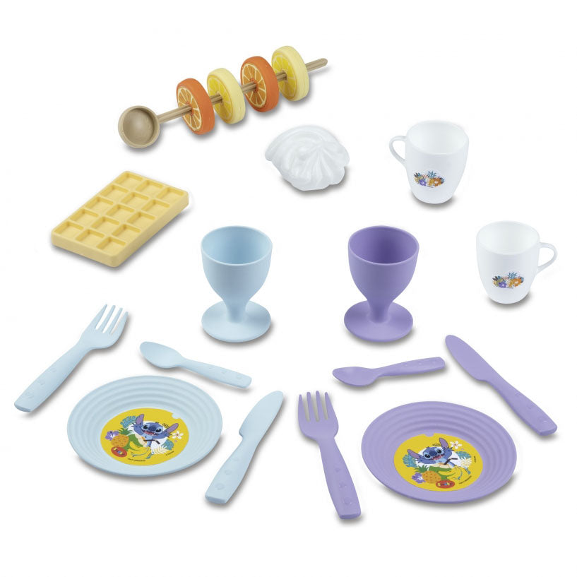 Número de piezas incluidas: 19 accesorios (2 tazas, 2 vasos, 2 platos, 2 cucharas, 2 tenedores, 2 cuchillos, 1 gofre, 1 merengue, 1 brocheta, 4 rodajas de fruta)