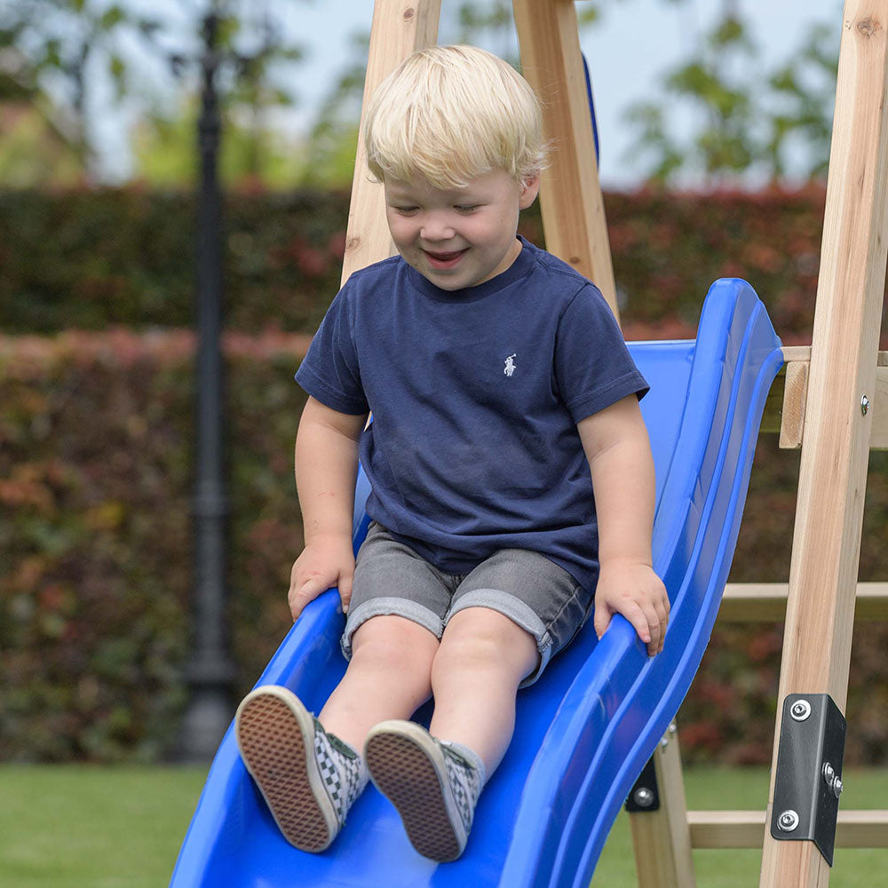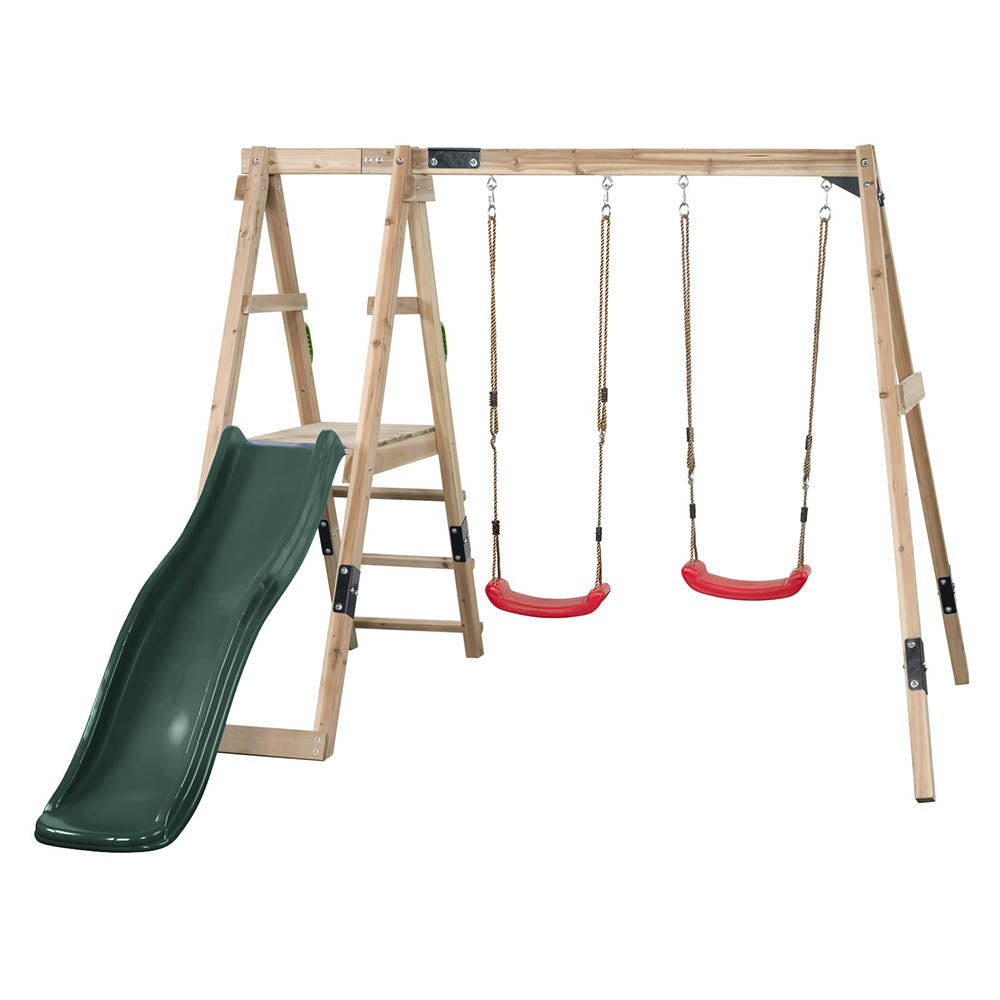 Su estructura de madera cuadrada impregnada certificada FSC® confiere estabilidad y durabilidad al conjunto, preparado para resistir las exigencias del juego infantil en exteriores. Incluye dos columpios ajustables en altura, una rampa de 1,75 m y un set de agarres manuales, lo que lo convierte en un centro de juego completo.