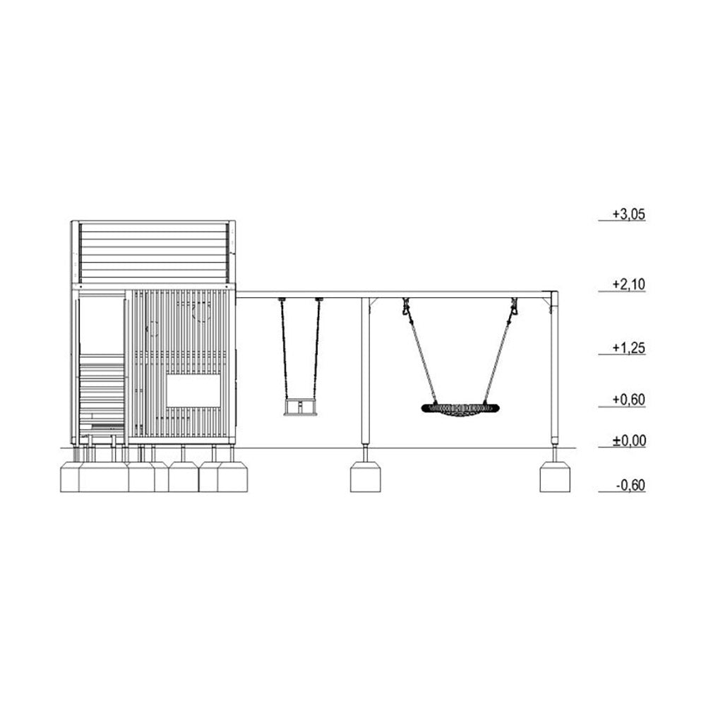 This version includes a swing combined with a nest and basket seat, expanding play possibilities both individually and in groups. Its modern aesthetic and compact dimensions allow it to be easily integrated into any outdoor space.