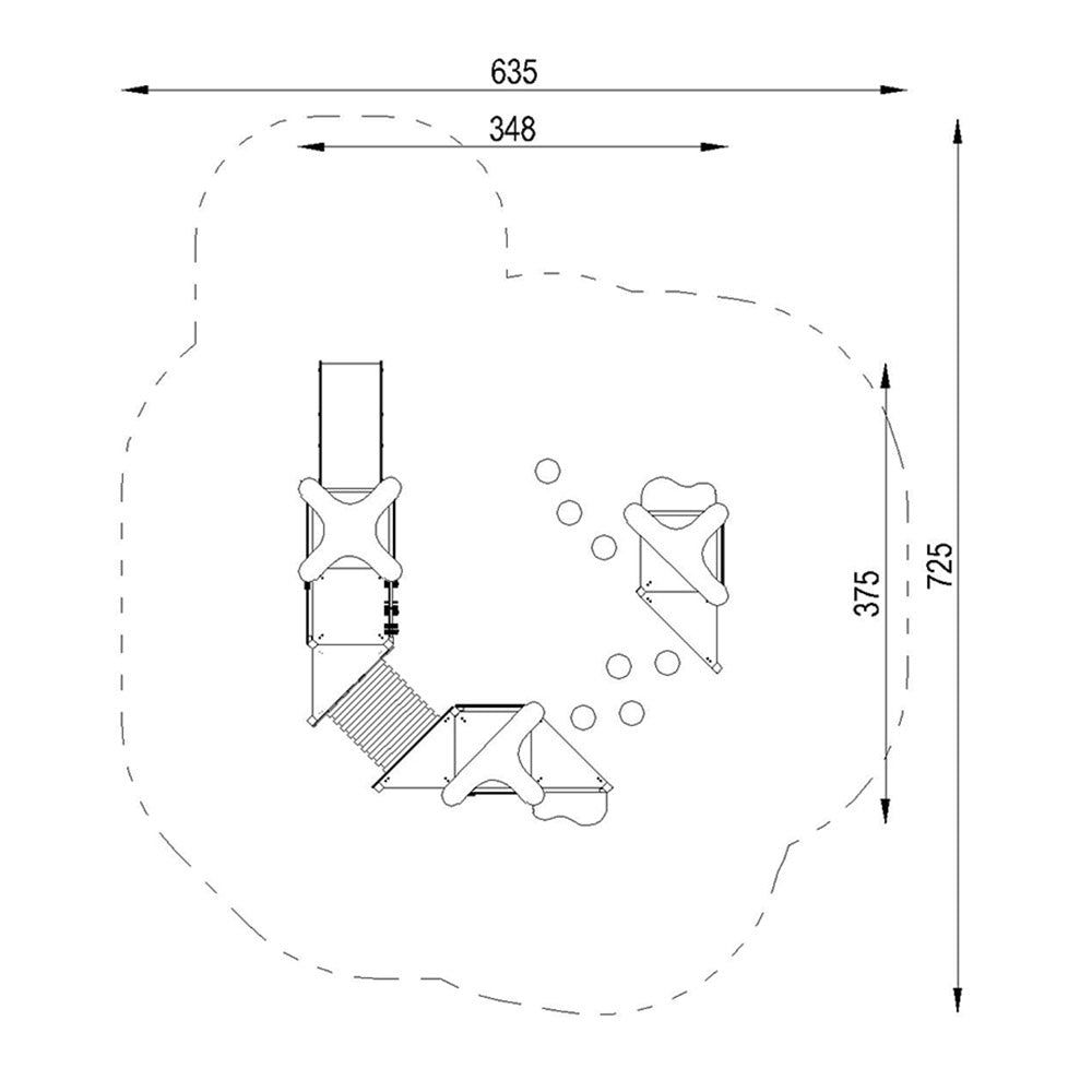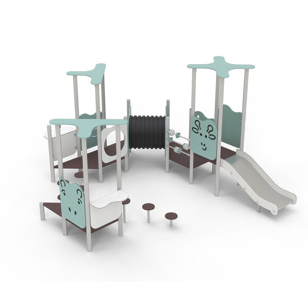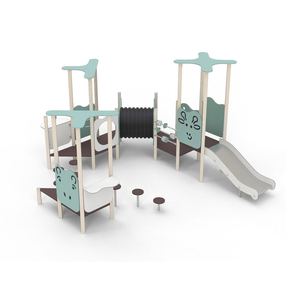 This model stands out for its variety of low-height towers, symbolic play elements, and dynamic zones that allow simultaneous use by numerous children.