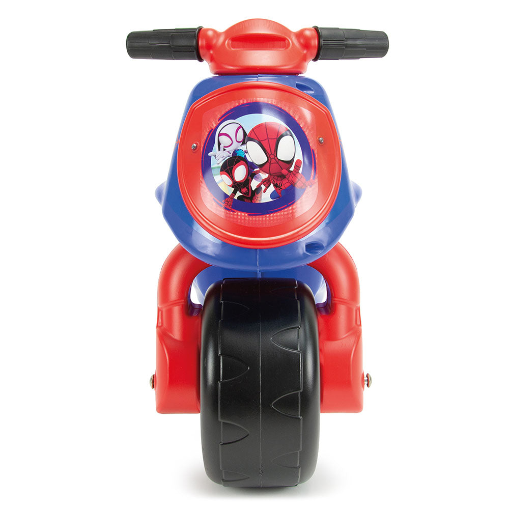 Esta moto correpasillos con licencia oficial de Spiderman (Marvel) está diseñada para que niños a partir de aproximadamente los 18 meses comiencen a desplazarse con seguridad. Cuenta con ruedas anchas para mayor estabilidad, decoración impermeable permanente gracias al sistema IML, y un asa de transporte para que los padres puedan moverla fácilmente.