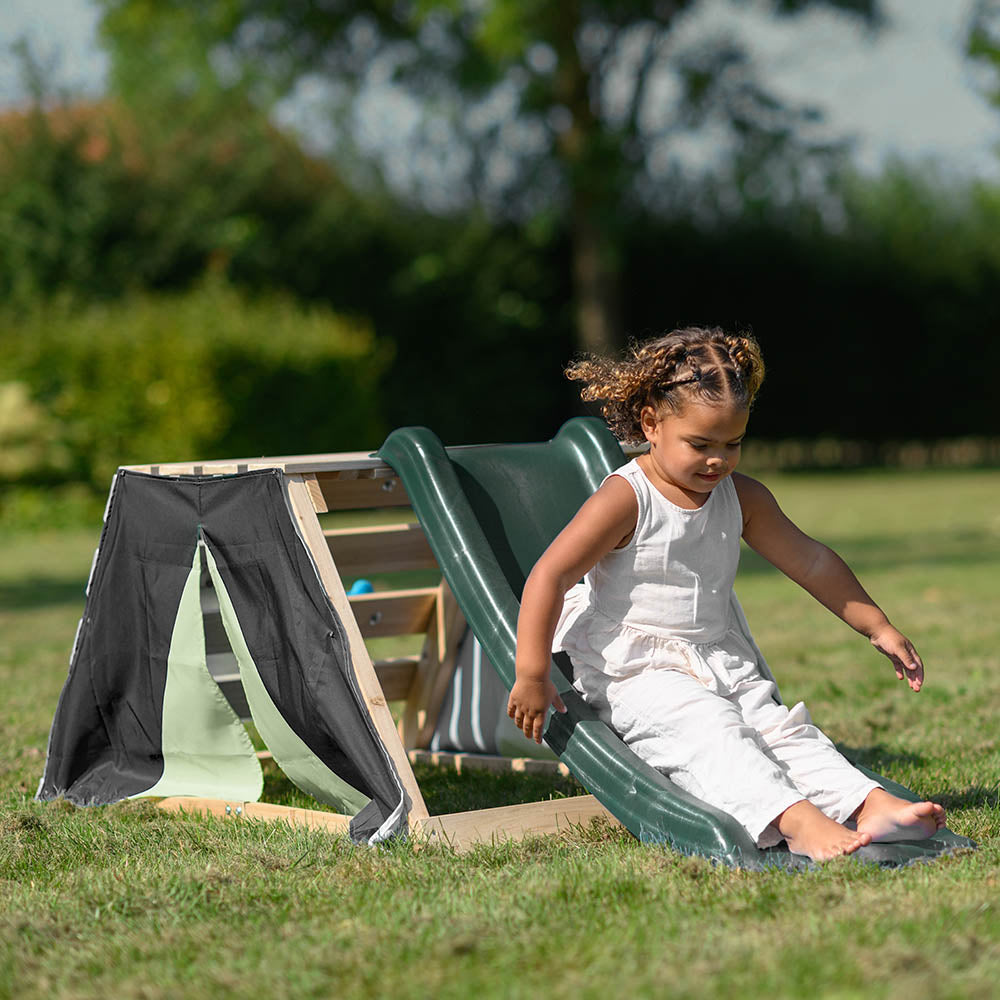 El Parque Infantil Charlie Small de Swingking es un juego infantil de exterior compacto ideal para jardines y espacios reducidos. Incluye una glorieta / plataforma con tobogán de 1,2 m, zonas de escalada y escondite con tela, promoviendo el juego creativo y el desarrollo de habilidades físicas en niños pequeños. Es perfecto como primer parque infantil para edades tempranas.