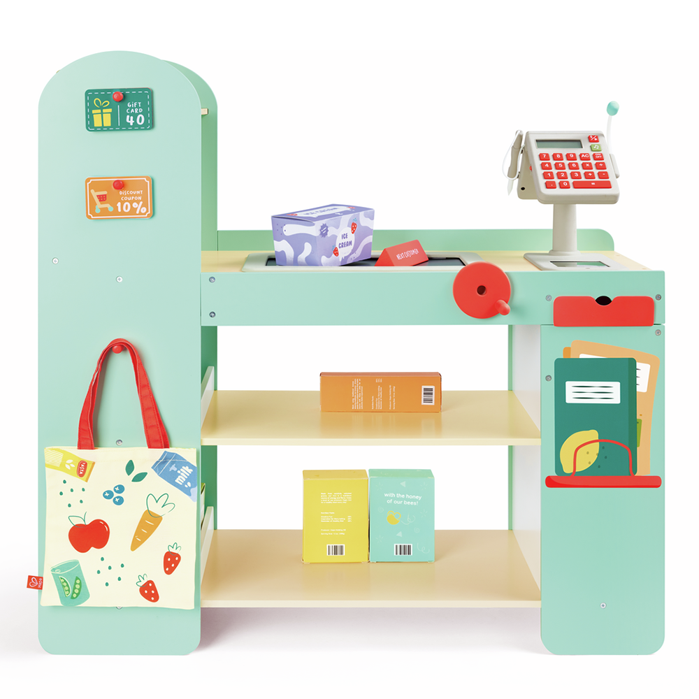 • Completa variedad de accesorios, como alimentos de imitación, dinero de juguete, una bolsa de compra de algodón y tarjetas educativas,