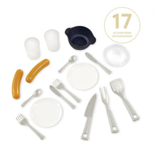 - 17 Accesorios de Juego: El conjunto incluye 2 vasos, 2 platos, cubiertos, 1 olla, 2 salchichas y otros utensilios esenciales para la cocina.