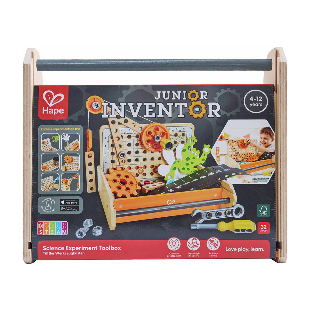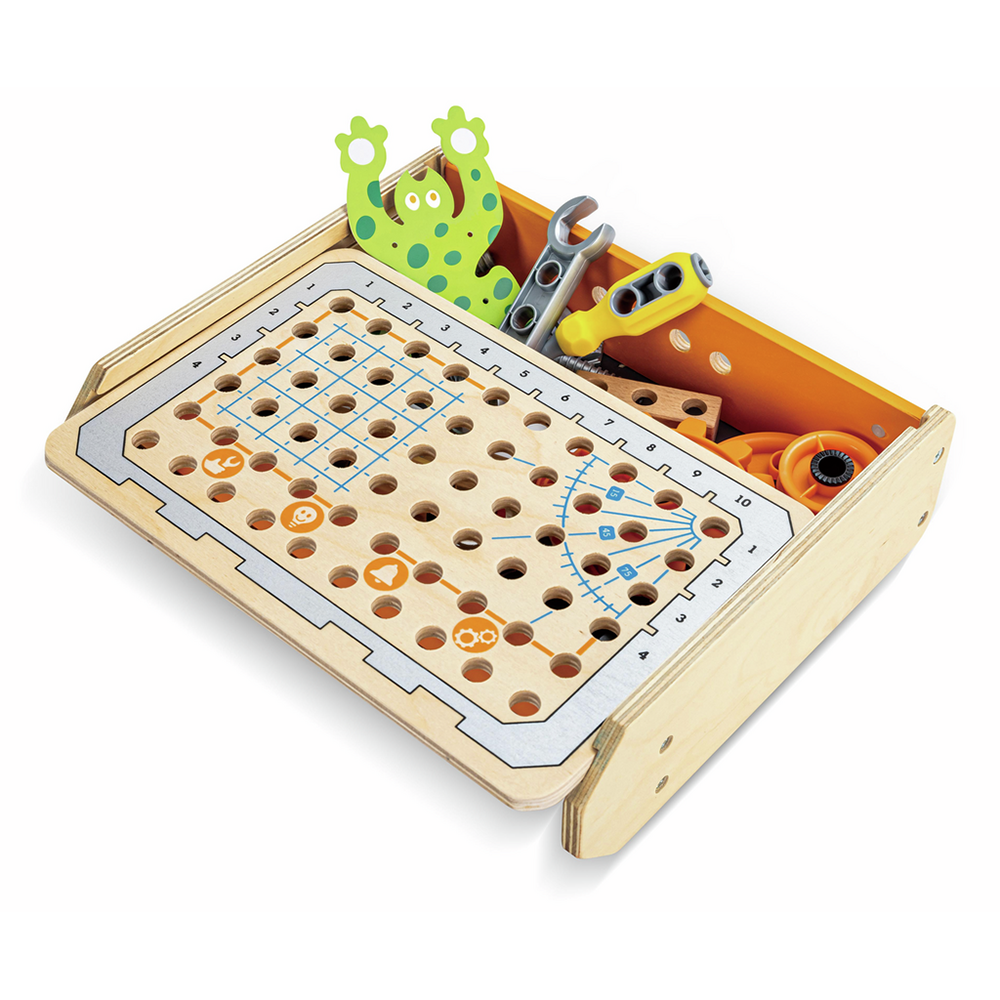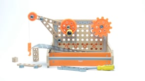 Una mesa de trabajo para futuros inventores con bloques de madera y piezas mecánicas que permiten realizar más de 10 experimentos diferentes. Ideal para estimular el pensamiento lógico y científico desde los primeros años.