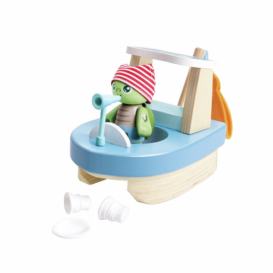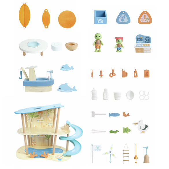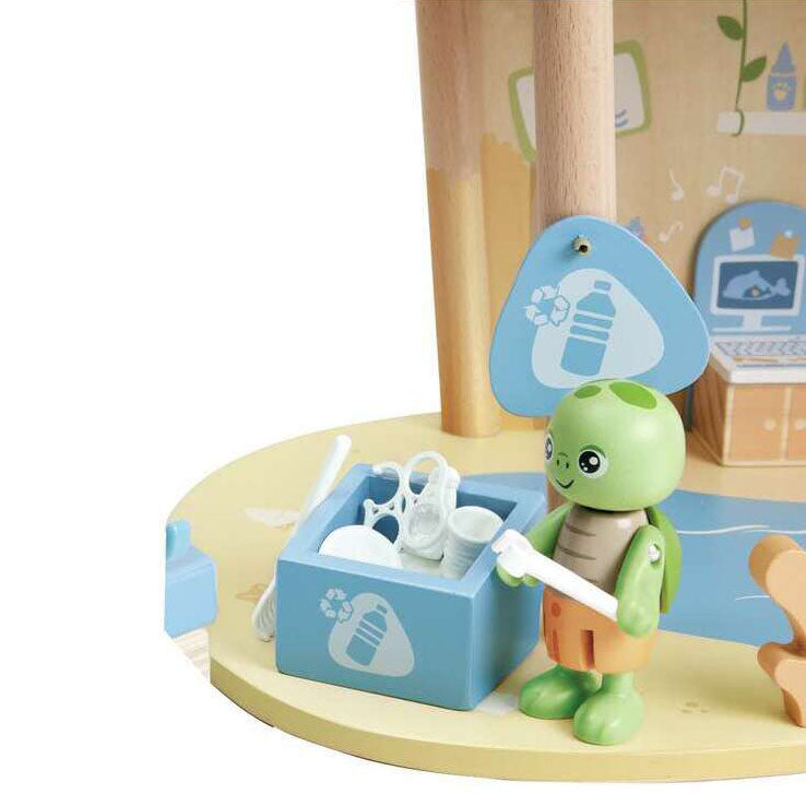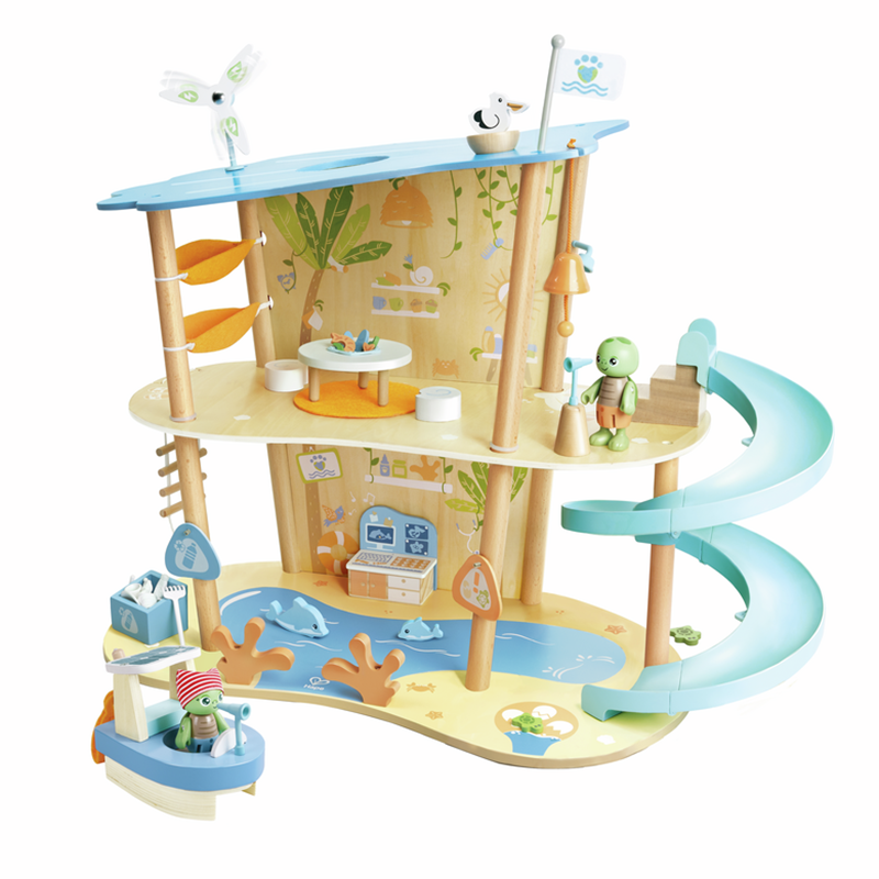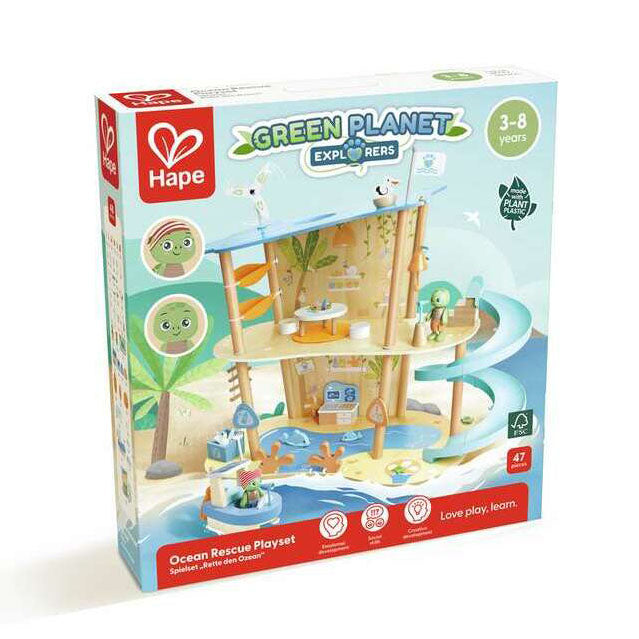 Este set de juego de roles de la marca Hape invita a los niños a convertirse en guardianes del mar. Con base de dos niveles, tobogán en espiral, barco de velocidad impulsado por energía solar, turbina eólica giratoria y accesorios de limpieza del océano, enseña valores ecológicos mientras estimula la imaginación y el juego simbólico.
