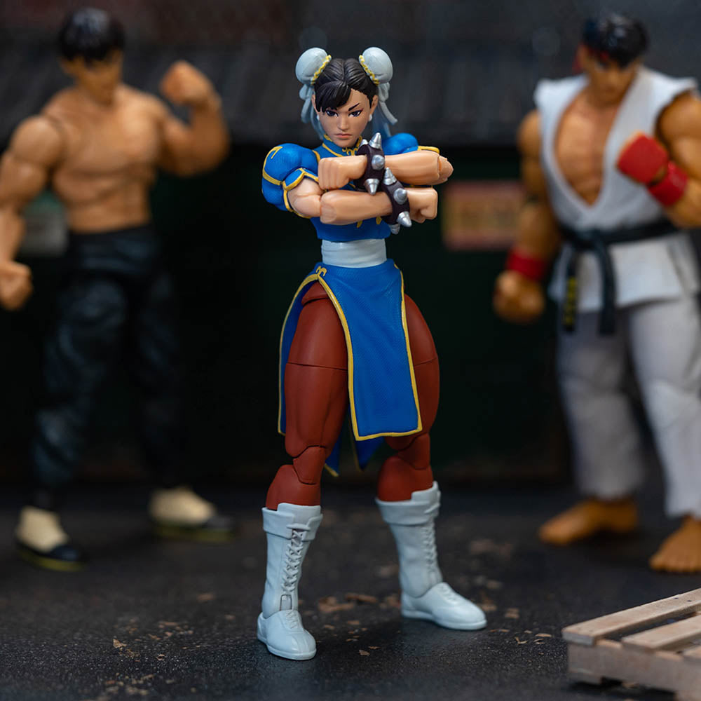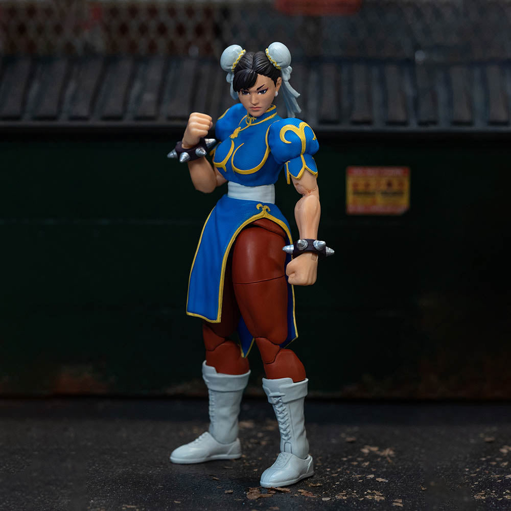 Licencia oficial: Street Fighter II (Capcom) con diseño auténtico de Chun‑Li (vestido azul, botas blancas, brazaletes con púas).