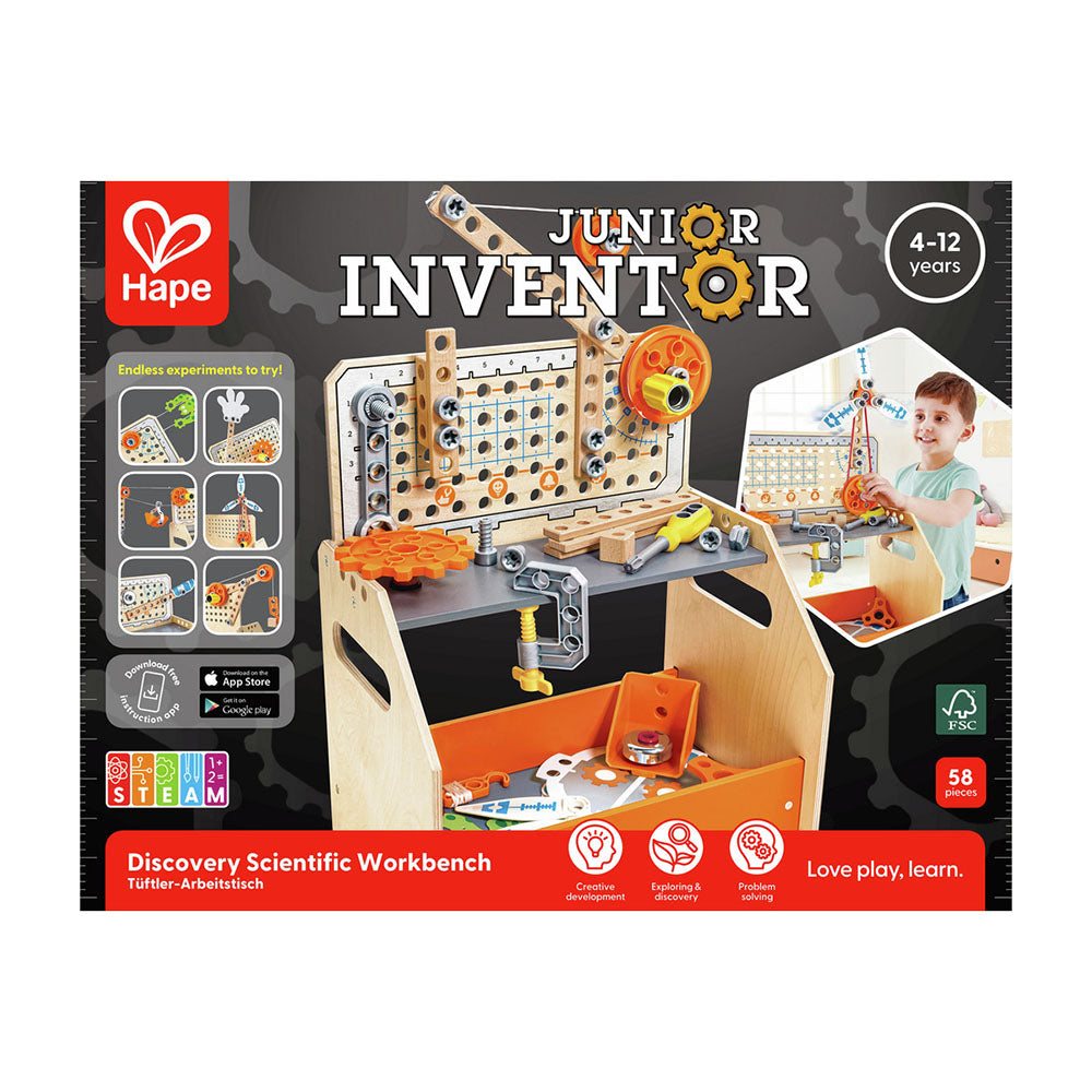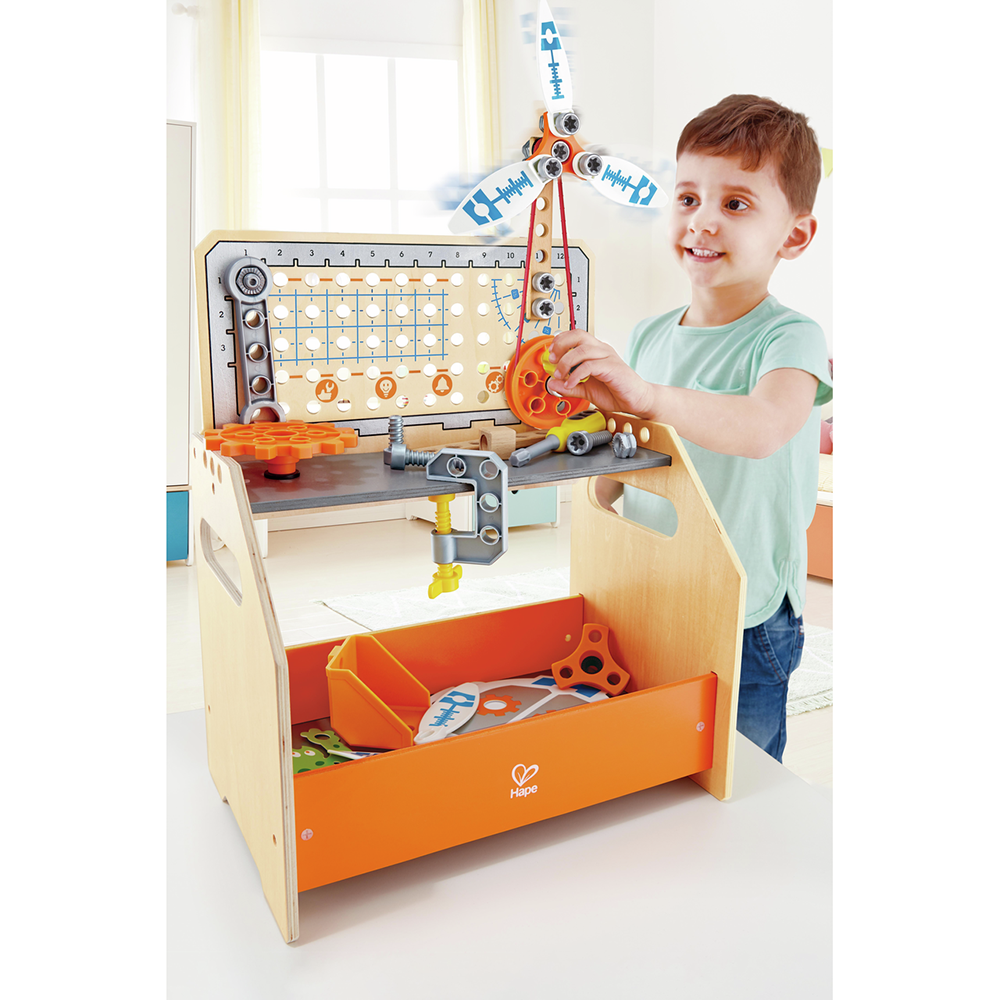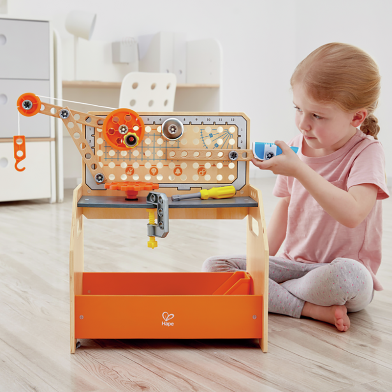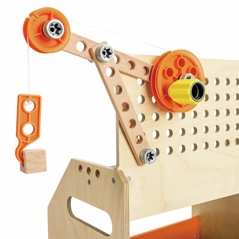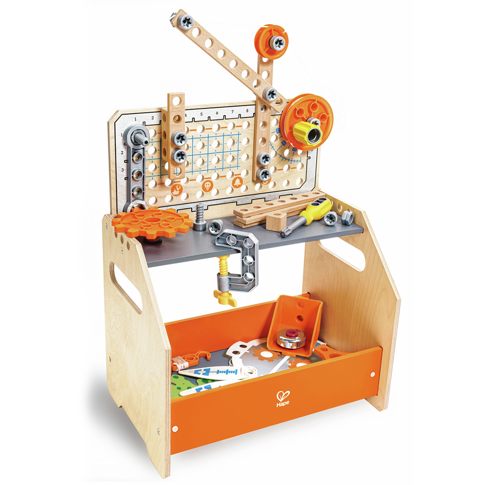 Una mesa de trabajo para futuros inventores con bloques de madera y piezas mecánicas que permiten realizar más de 10 experimentos diferentes. Ideal para estimular el pensamiento lógico y científico desde los primeros años.