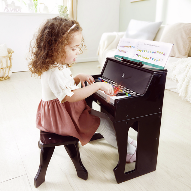 Este piano electrónico con 25 teclas y un cómodo asiento es perfecto para introducirse en el fantástico mundo de la música. Con ayuda de las teclas que se iluminan, los niños y niñas pueden aprender sus primeras piezas musicales. Incluye diferentes sonidos de instrumentos, 6 melodías simples para tocar y 8 ritmos de tambor.