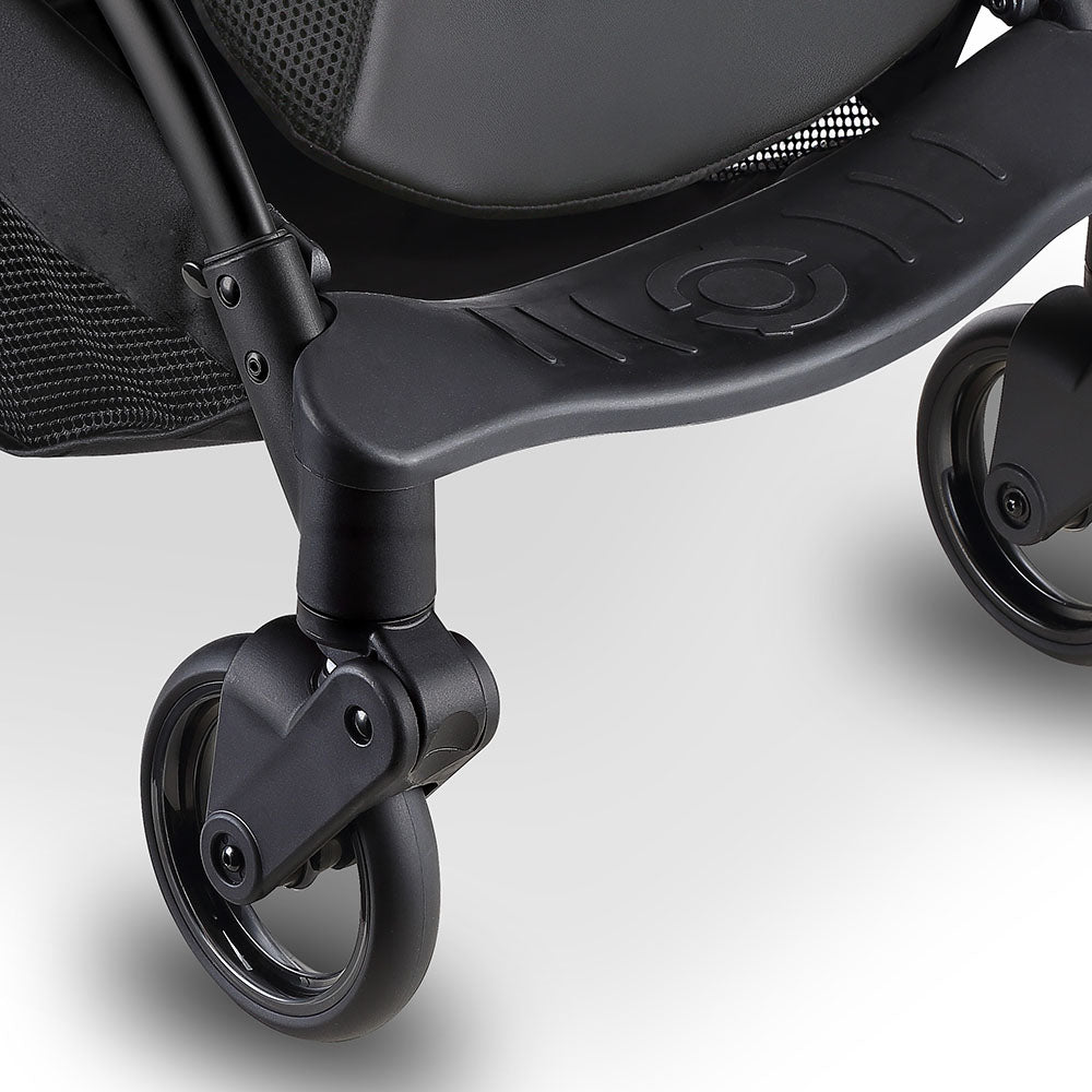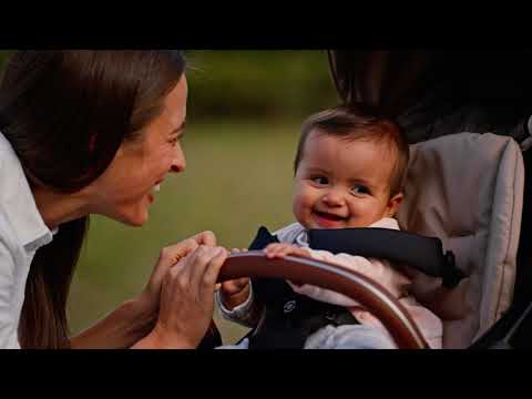 • Arnés 5 puntos + barra frontal y ruedas con suspensión: proporciona seguridad y confort.