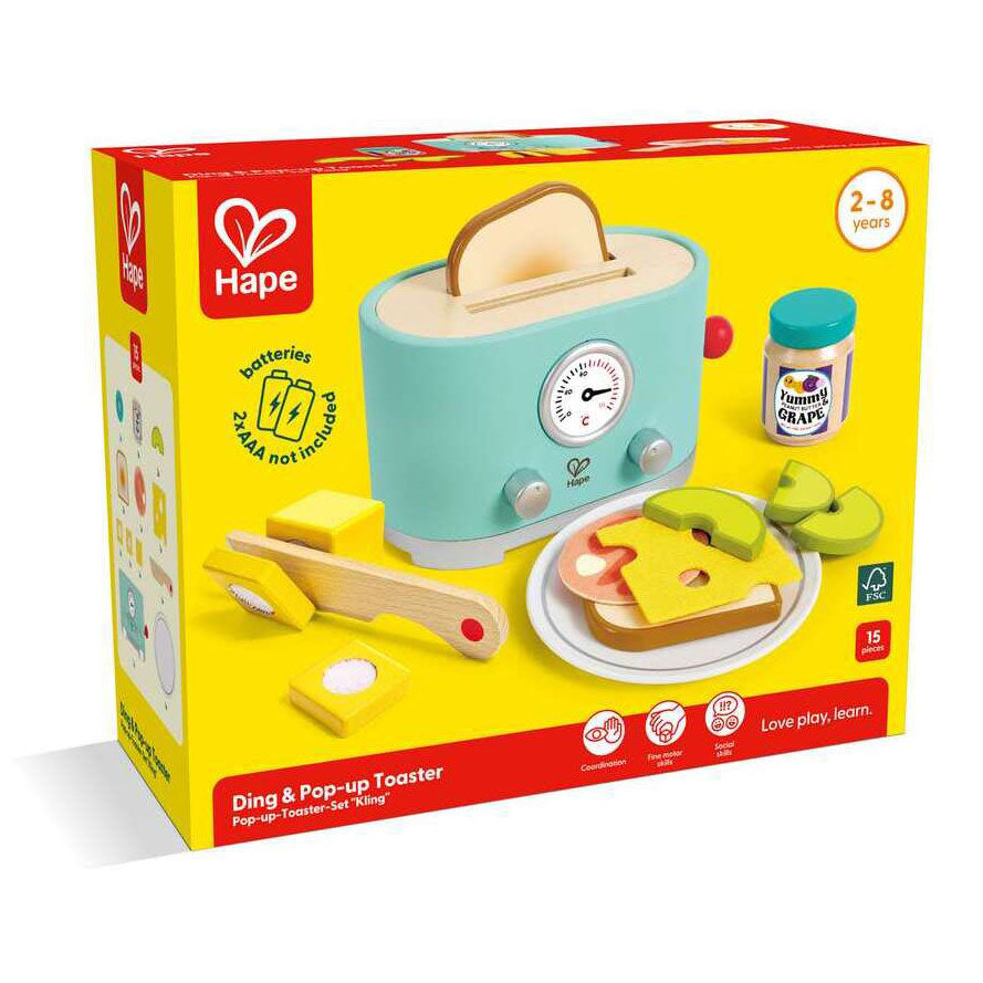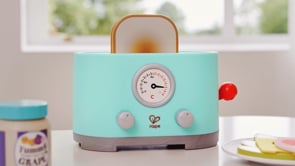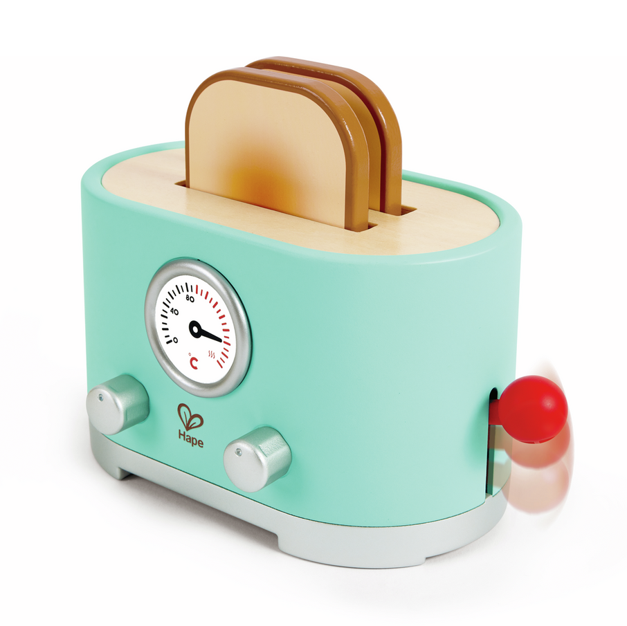 Una tostadora de juguete en madera que reproduce el sonido “ding” cuando la tostada salta y anima al niño a jugar al desayuno. Accesorios incluidos como rebanadas, rodajas de aguacate, mantequilla, etc.
