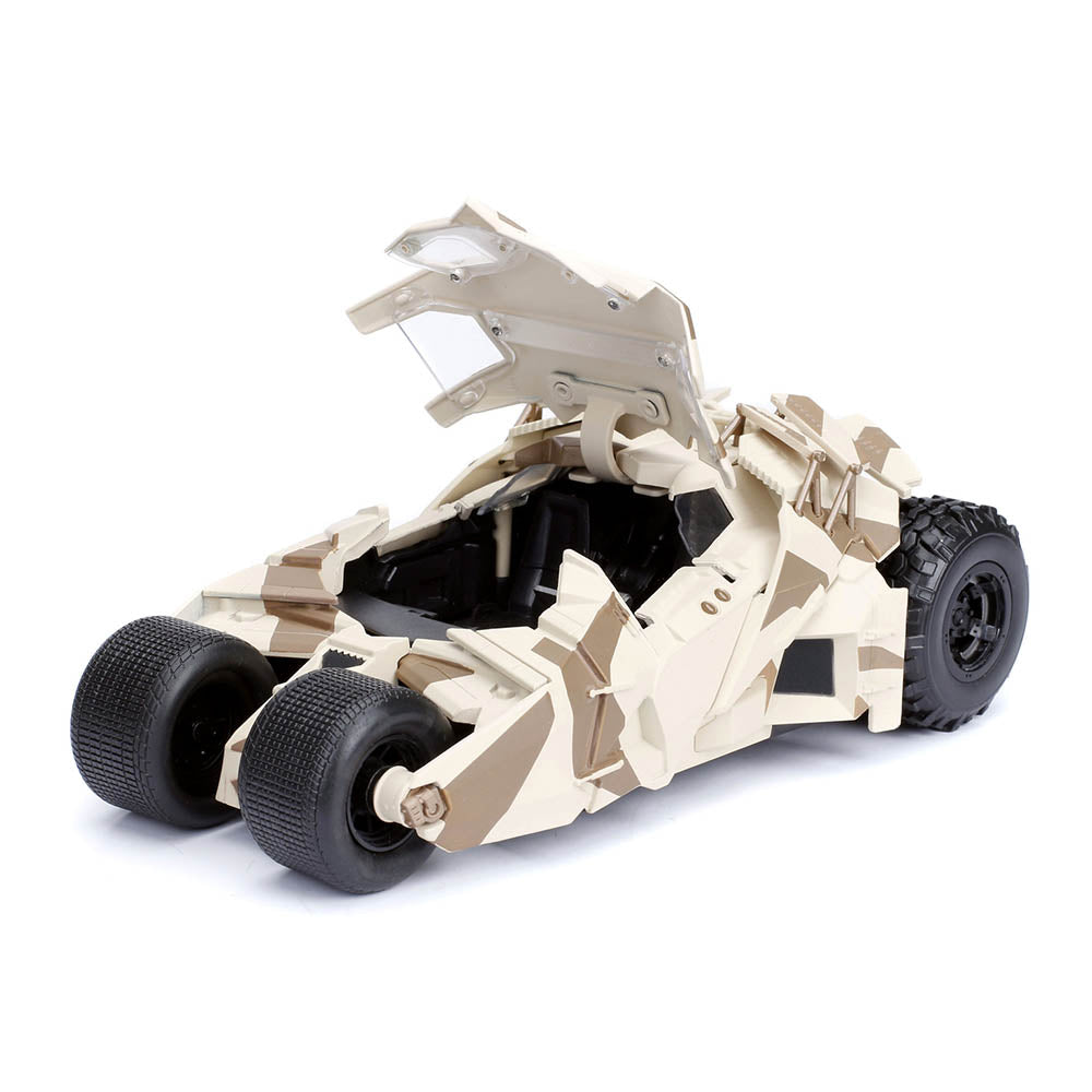 Este modelo a escala 1:24 reproduce el icónico Tumbler Batmóvil de la película El Caballero Oscuro (2008), presentado en un acabado camuflaje militar que evoca un estilo táctico y realista. Fabricado con carrocería metálica die‑cast y ruedas de goma, incluye figura metálica de Batman (≈ 7 cm) y presenta cabina con apertura accesible, lo que lo convierte en una pieza ideal tanto para coleccionistas como para exposición o juego ligero.