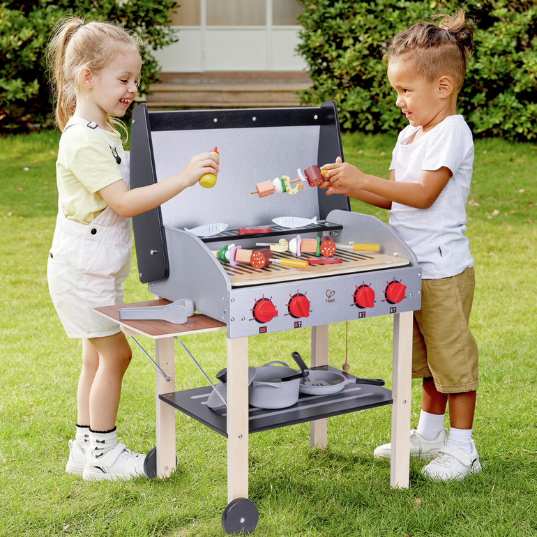 La barbacoa de juguete Hape es un set lúdico que recrea la experiencia del asado familiar en versión miniatura. Incluye parrilla doble, carbón de juguete, brochetas, carnes de madera y utensilios para que los niños disfruten del juego de rol mientras desarrollan habilidades sociales y creativas.