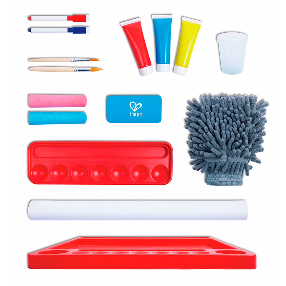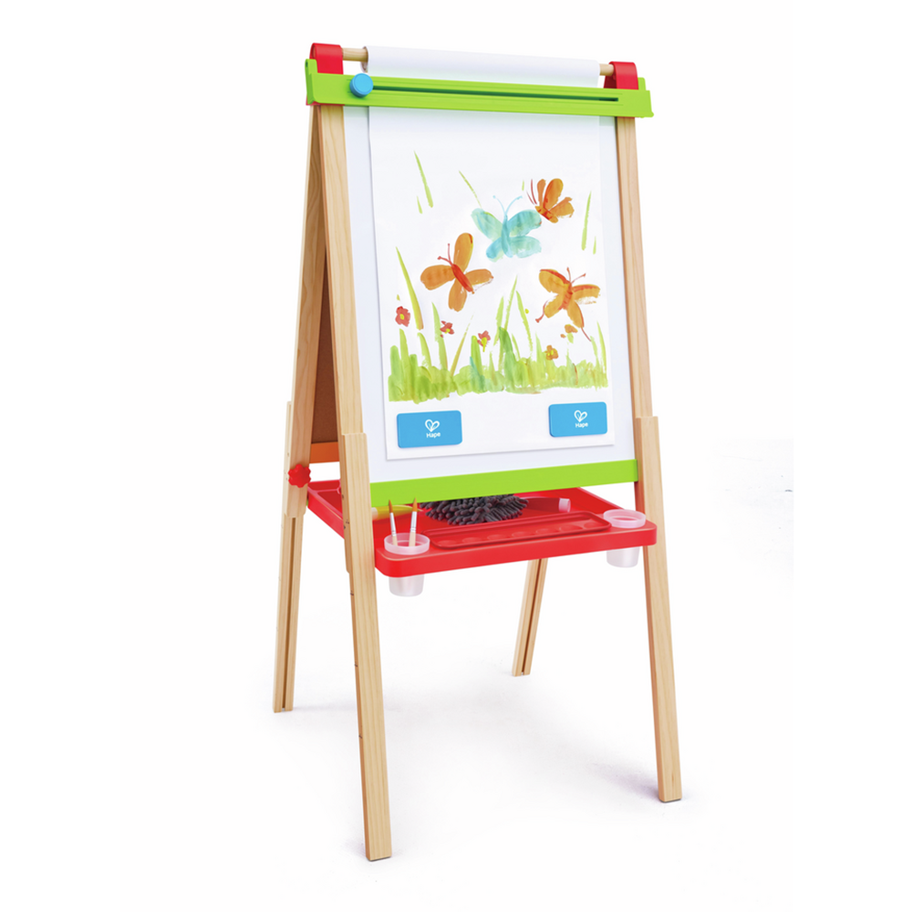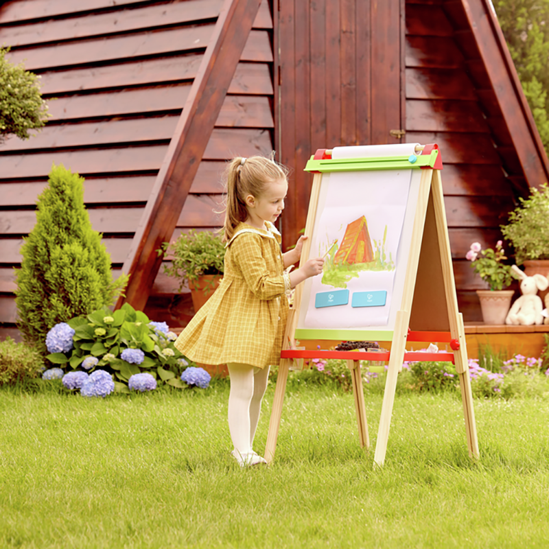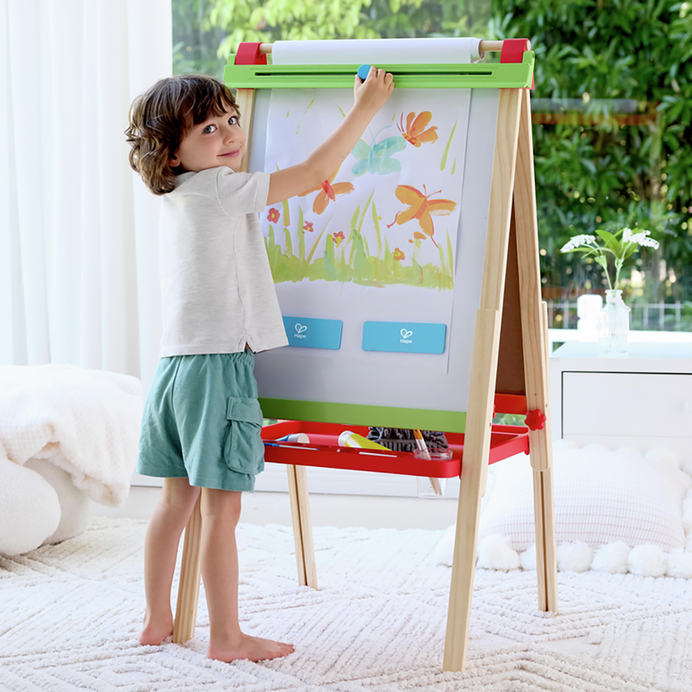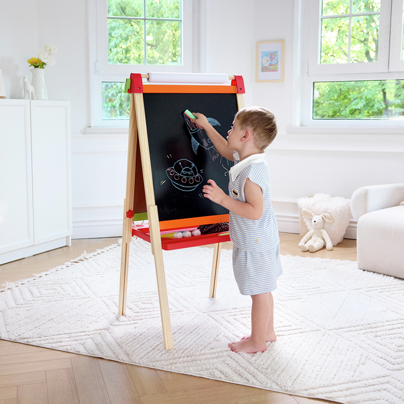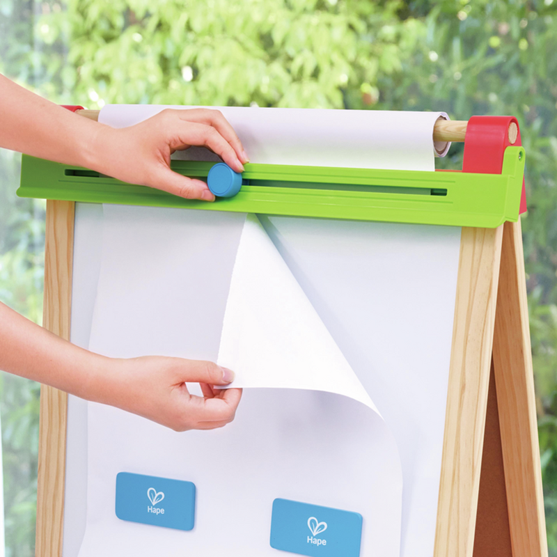 El caballete Little Artist’s 4‑in‑1 de Hape es una solución artística versátil para niños de 3 a 10 años. Con doble superficie (pizarra blanca magnética + pizarra de tiza), soporte para rollo de papel, función de corte de papel integrada y ajuste de altura, este caballete acompaña el crecimiento del niño mientras estimula su creatividad.