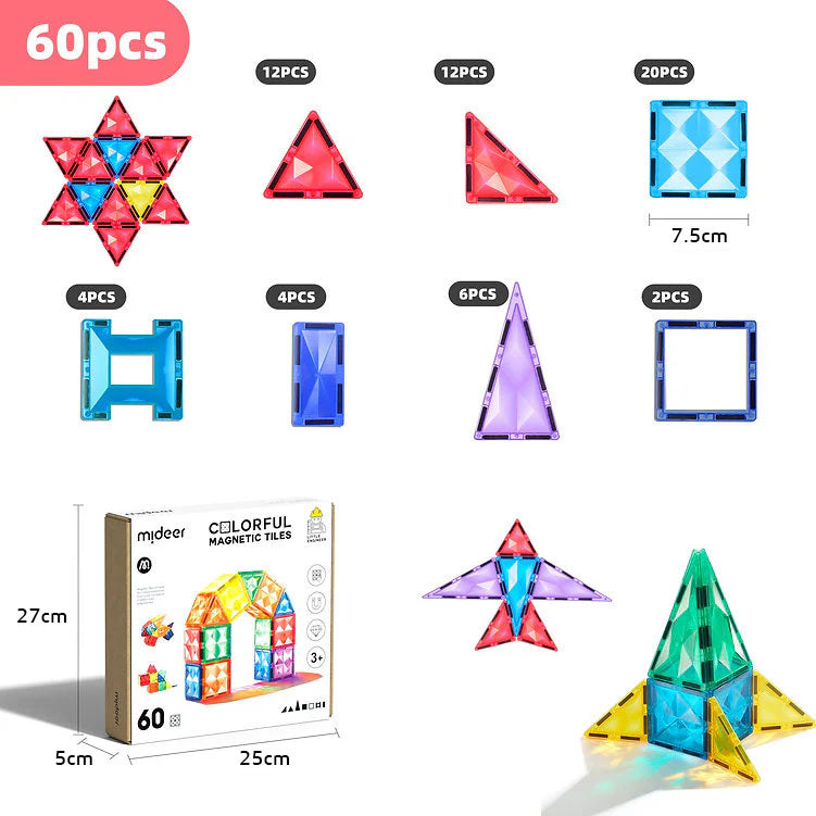 Los Azulejos Magnéticos 60 Piezas de Mideer son un set de construcción ideal para introducir a los niños en el mundo de la geometría y las estructuras tridimensionales. Con sus piezas magnéticas planas y de colores translúcidos, permiten crear figuras en 2D y construcciones en 3D de forma intuitiva, segura y estable.